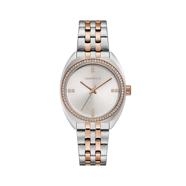 Caravelle Ladies Retro Two Tone Rose and Silver Stainless Steel Bracelet Watch with Crystal Bezel. Retro-style, modern glamour! 80 brilliant crystals embellish a silver-white sunray dial and saddle-shaped two-tone rose gold and stainless steel case and bracelet with double-push fold-over closure. Case Diameter: 32mm. Case Thickness: 8.6mm. Water Resistance: 50M. 3-year Limited Warranty